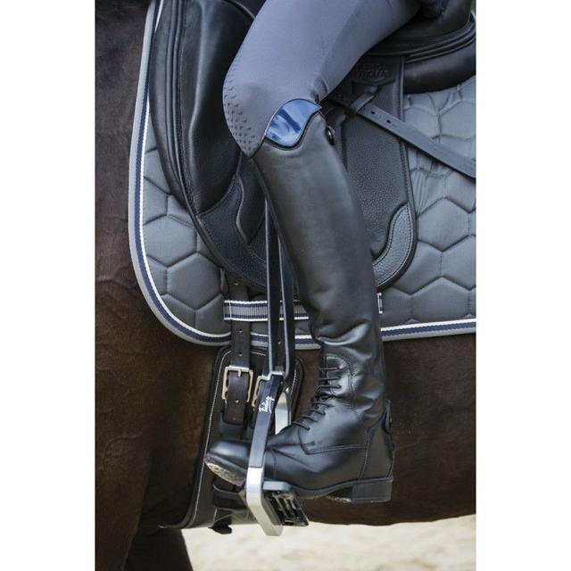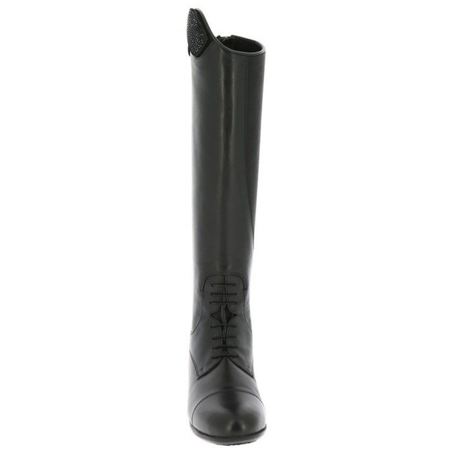 En cuir pleine fleur souple, lisse, avec lacets élastiques à l'avant et surpiqûres ton sur ton en pointe. Décorées d'un patch strass noirs monté sur bande auto-agrippante. Face intérieure en cuir gras pour une meilleure fixité du bas de la jambe. Fermeture arrière à glissière YKK montée sur support élastique, sécurisée par un bouton pression sur rabat cuir en bas et sur montant élastique en haut de tige. Doublure toute hauteur en cuir de porc. Première de propreté amovible en polyuréthane souple avec zones de répartition de la pression et insert en gel amortissant antichocs au talon. Voûte plantaire préformée améliorant le soutien et le confort. Doublure du pied absorbante et respirante en nylon/mousse. Semelle extérieure antidérapante en caoutchouc avec zone confort en polyuréthane souple à picots et ventilation "Air System" à double effet : circulation d'air dans la semelle et évacuation par la valve sortante positionnée sur le talon. Effet cousin d'air amortissant.