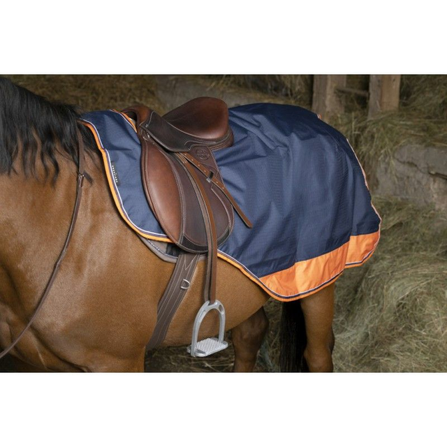 En polyester Ripstop 600 deniers imperméable et respirant sur le dessus, partie basse imperméable, avec doublure en micro-polaire anti-peluches. Découpe de selle et coupe réduite à l'avant pour un meilleur contact. Fermeture par bande auto-agrippante au garrot et courroie de queue.
