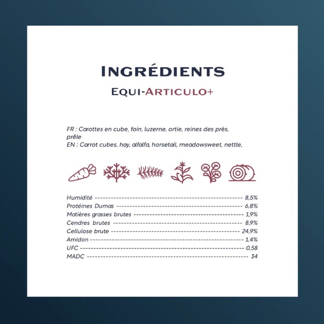 Voici notre recette innovante composées de plantes efficaces et 100% naturelles, sans céréale et sans mélasse pour améliorer le bien être articulaire de votre cheval