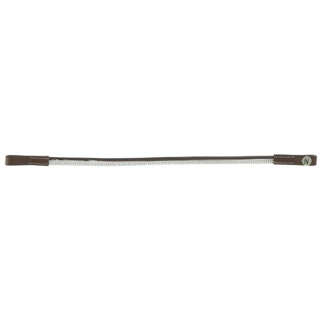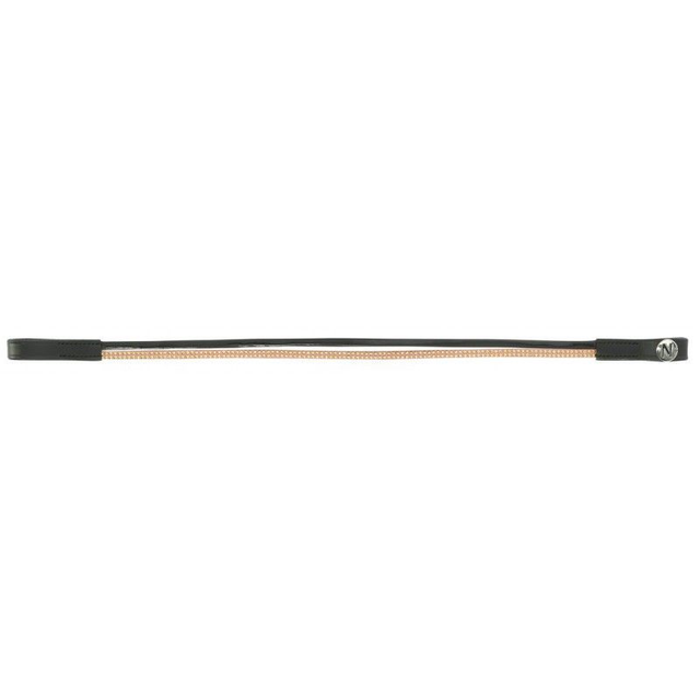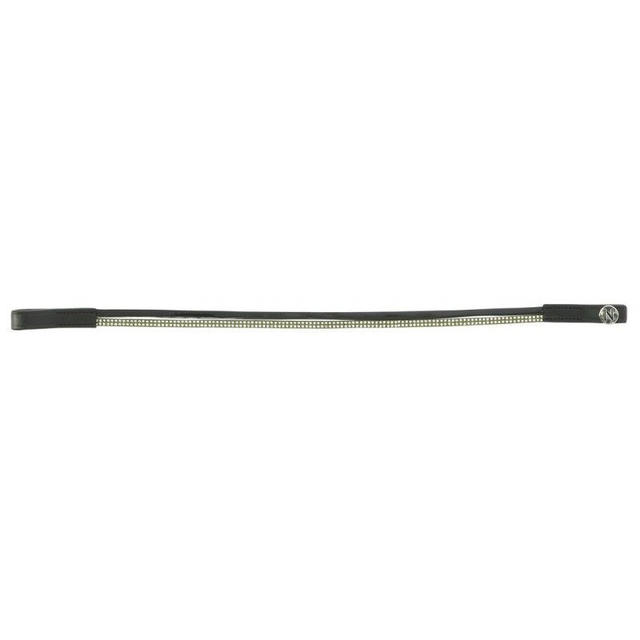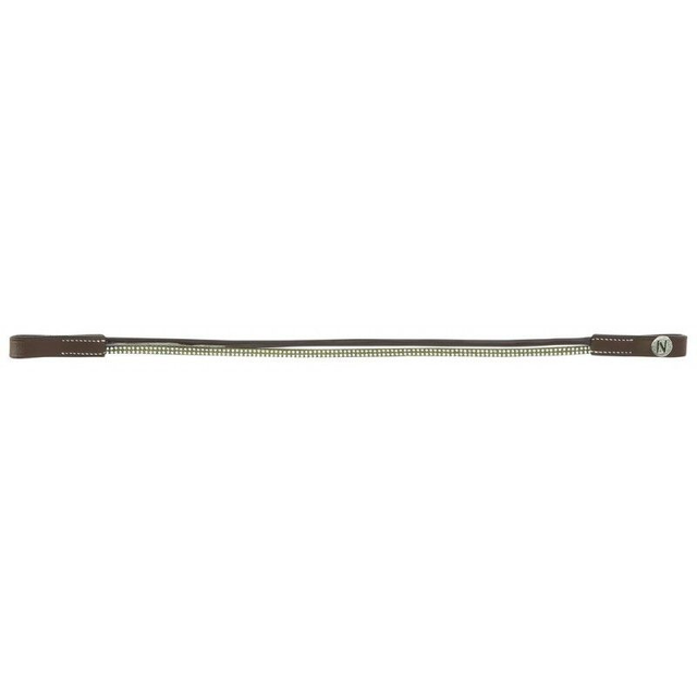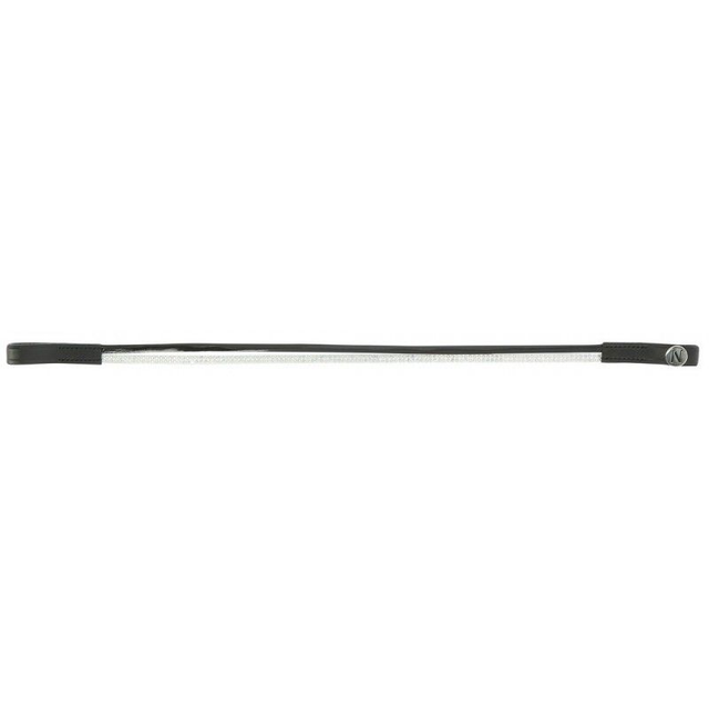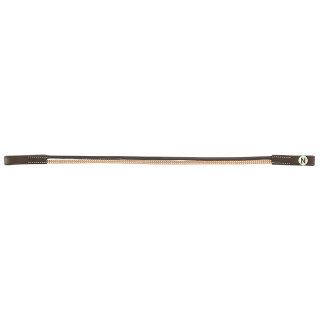 Frontal en cuir de buffle avec deux lanières : une en polyuréthane aspect cuir vernis et une en polyester ornée de petits clous brillants. Coutures noires pour cuir noir et blanches pour cuir havane.