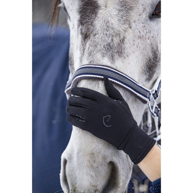 Gants chauds, doublés fibres polaires. 2 doigts compatibles écrans tactiles, pour pouvoir utiliser votre téléphone, avec vos gants. Paumes de la main avec des renforts silicone pour renforcer la tenue des rênes. Dessus en polyester avec un toucher douillet agrémenté du logo EQUITHÈME.