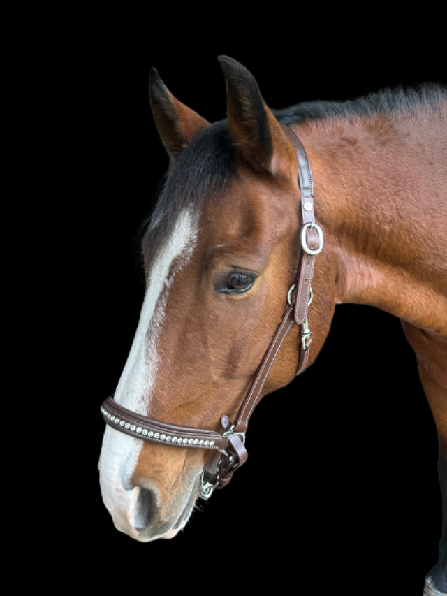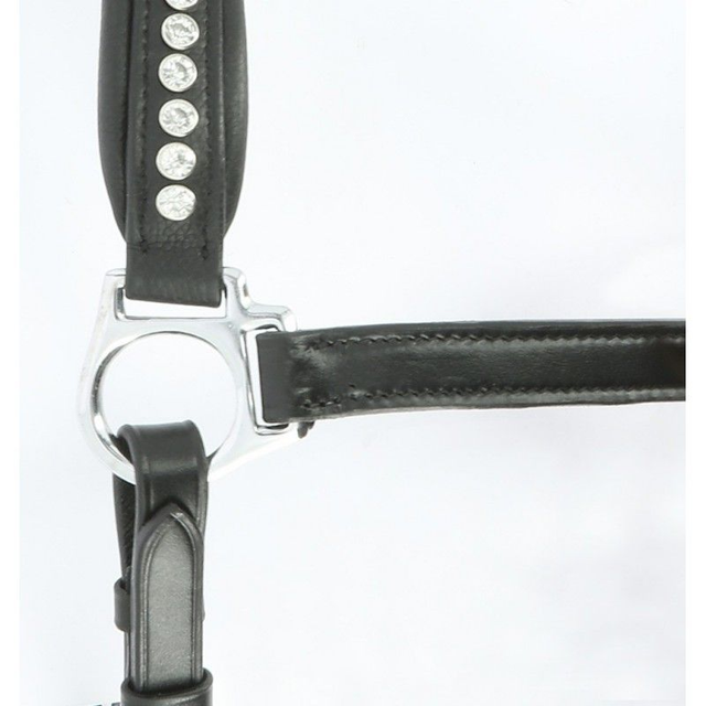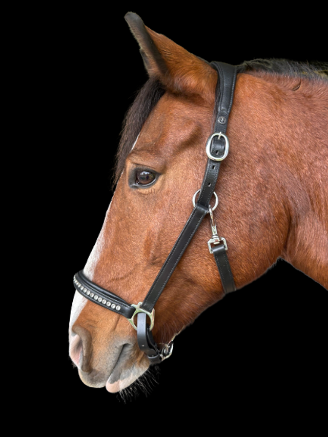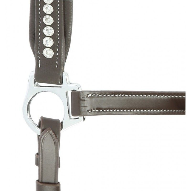 Licol en cuir de buffle, avec têtière anatomique double réglage, doublée cuir vachette. Muserole réglable à 3 mousquetons, décorée de strass transparents et doublée en cuir vachette. Coutures noires pour cuir noir et coutures blanches pour cuir havane. Bouclerie en inox.